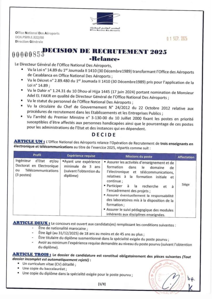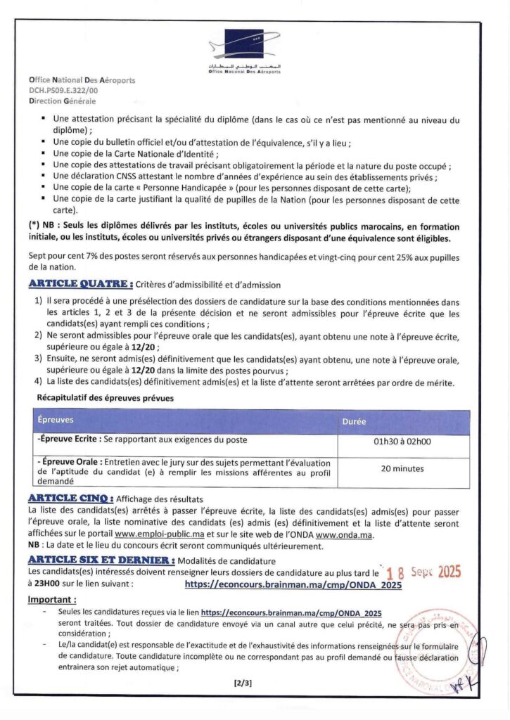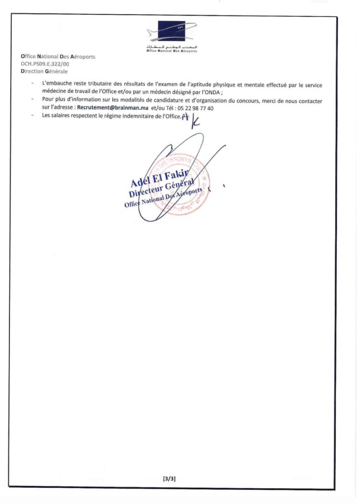 L’embauche reste conditionnée à l’aptitude physique et mentale, vérifiée par le médecin du travail de l’ONDA. Toute déclaration erronée ou dossier incomplet entraînera le rejet automatique.