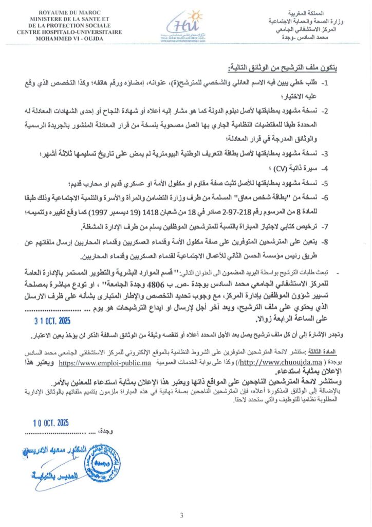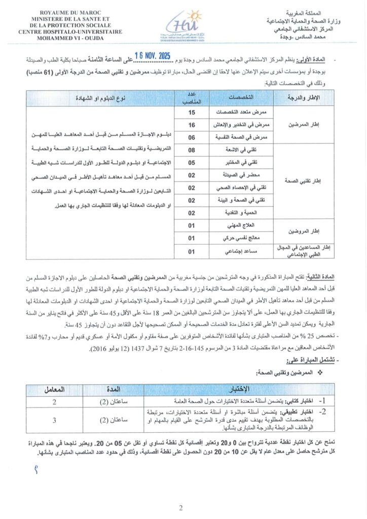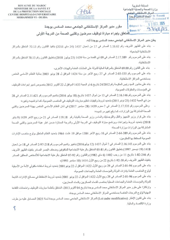 Le Centre Hospitalier Universitaire CHU Mohammed VI Oujda organise un concours pour le recrutement de 61 postes répartis comme suit: