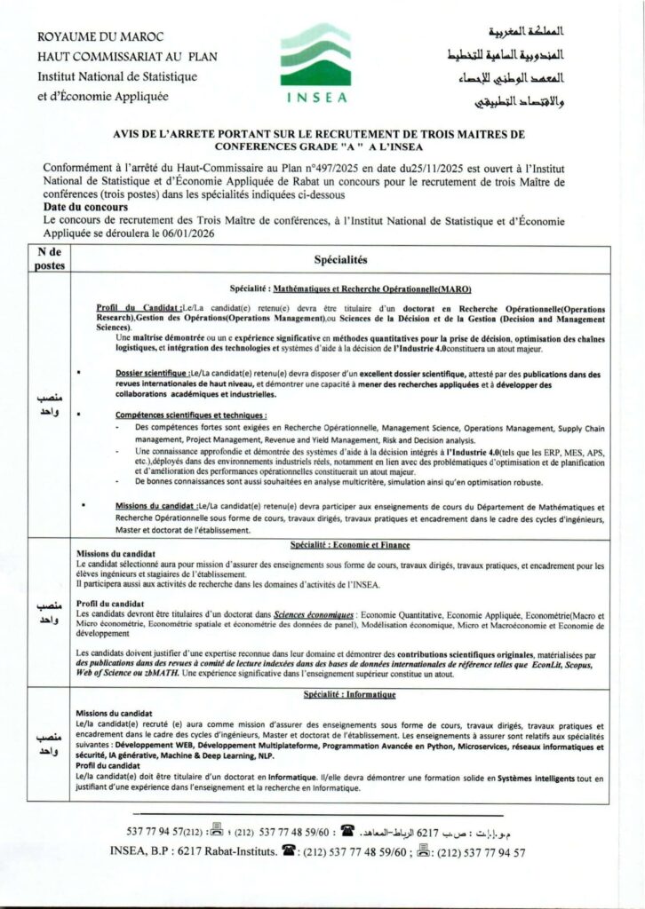 Concours 2025 – Trois postes de Maître de conférences grade A à l’INSEA.