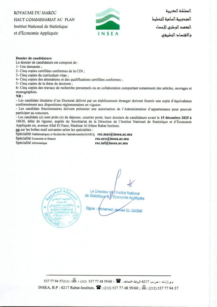 Les dossiers sont à déposer avant le 15 décembre 2025 au Secrétariat de la Direction de l’INSEA, Avenue Allal El Fassi, Madinat Al Irfane, Rabat, ou par mail selon la spécialité: