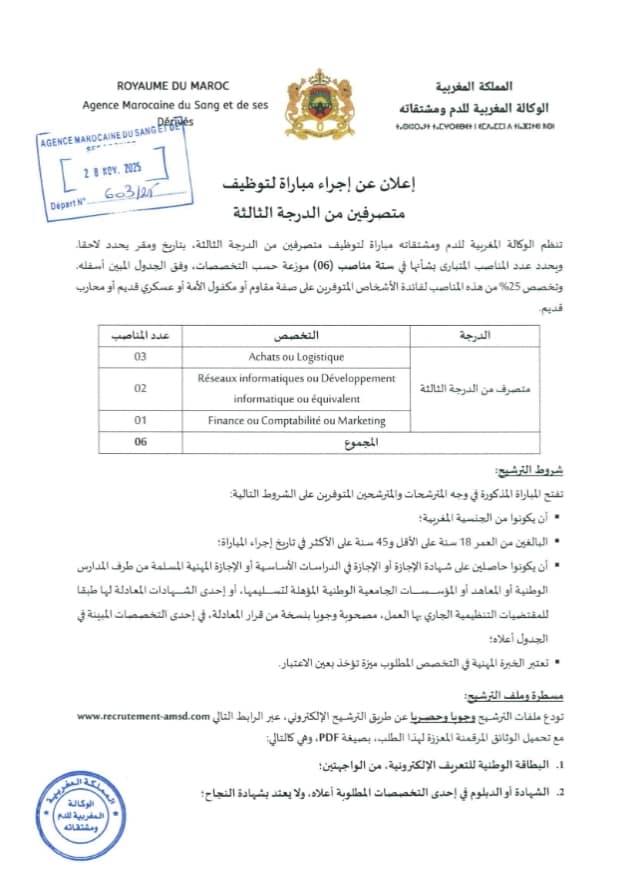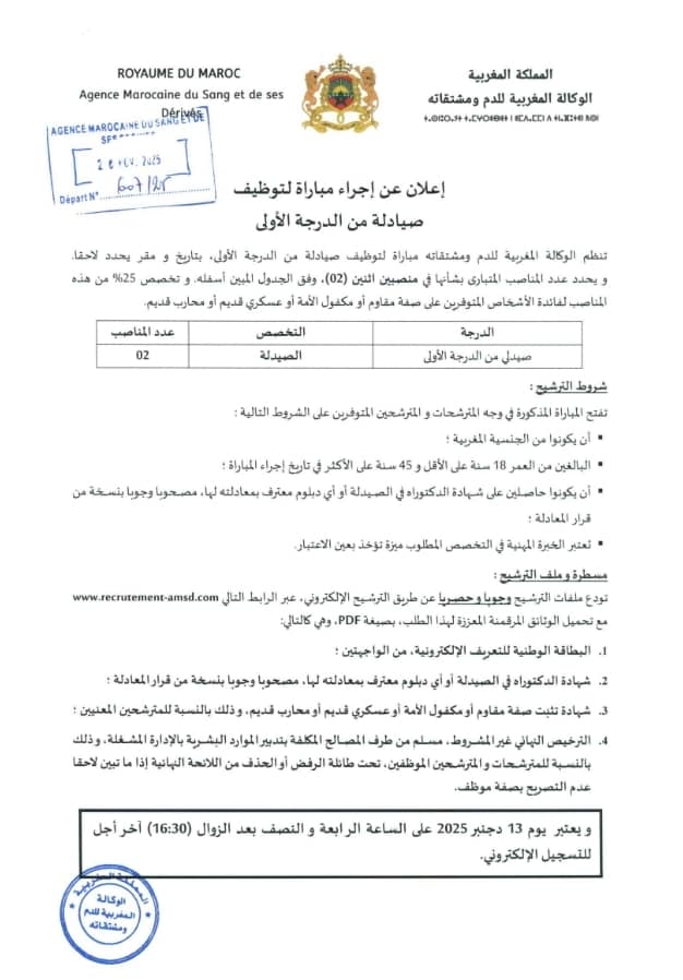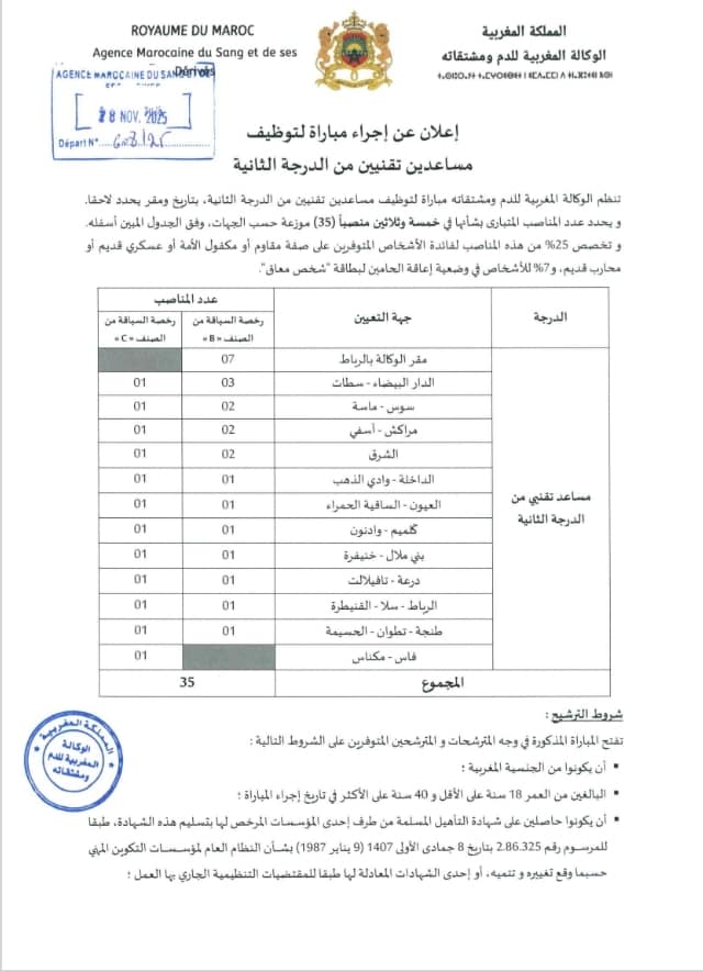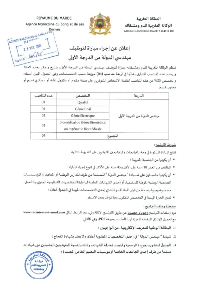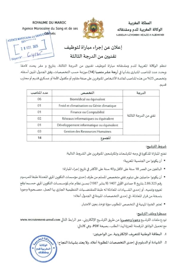 مباراة توظيف 70 منصب بالوكالة المغربية للدم ومشتقاته 2025