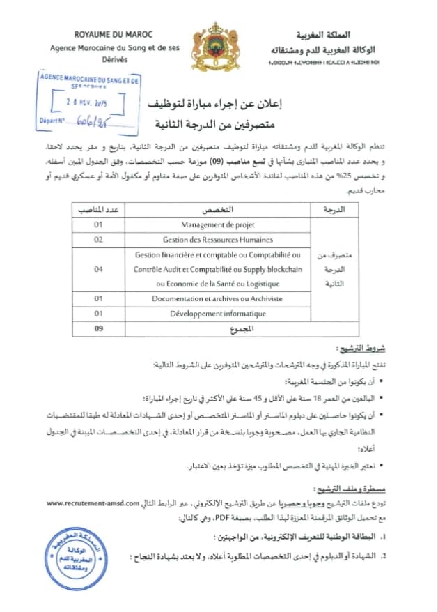 مباراة توظيف 70 منصب تخصصات مختلفة بالوكالة المغربية للدم ومشتقاته .